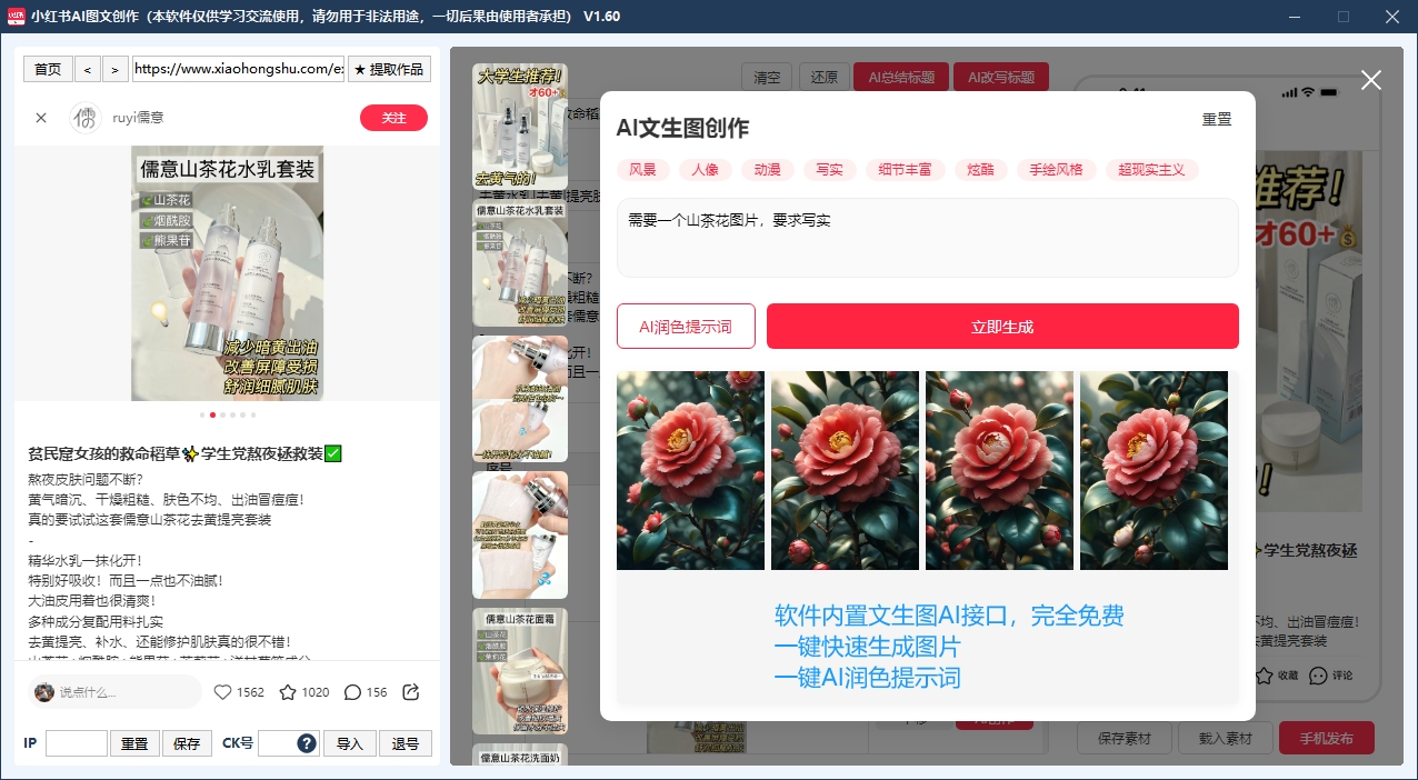 小红书AI图文创作发布工具 100%过检测克隆笔记+AI改写标题内容+文生图免费生成 电脑创作手机扫码一键发布权重更高 正版软件长期更新
