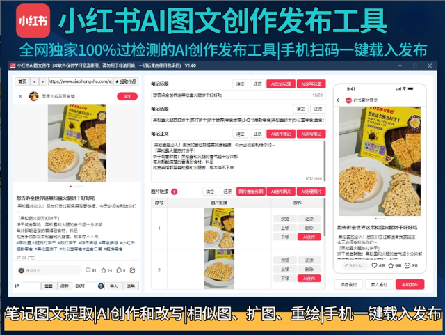 小红书AI图文创作发布工具丨100%过检测AI处理图片+笔记一键生成丨电脑创作手机扫码发布权重更高