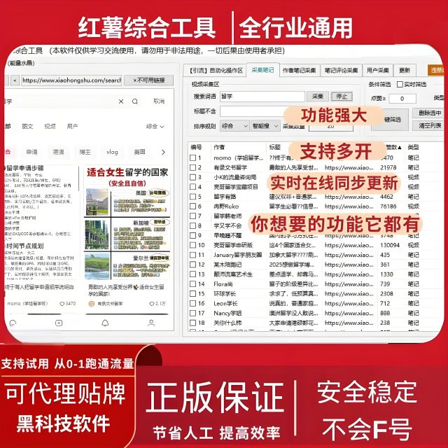 小红书批量采集笔记评论工具 支持关键词批量采集笔记和评论,自动执行关注点赞私信等操作。内置AI文案生成和智能养号系统,配合多开IP防封机制,高效矩阵营销。正版授权永久更新,远程安装指导。
