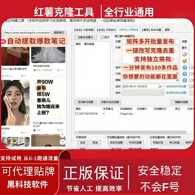 小红书批量发布工具 支持笔记克隆搬运+AI智能改写+指纹浏览器防封环境 内置5大AI模型无需额外付费 账号无限多开矩阵运营 正版买断永久授权